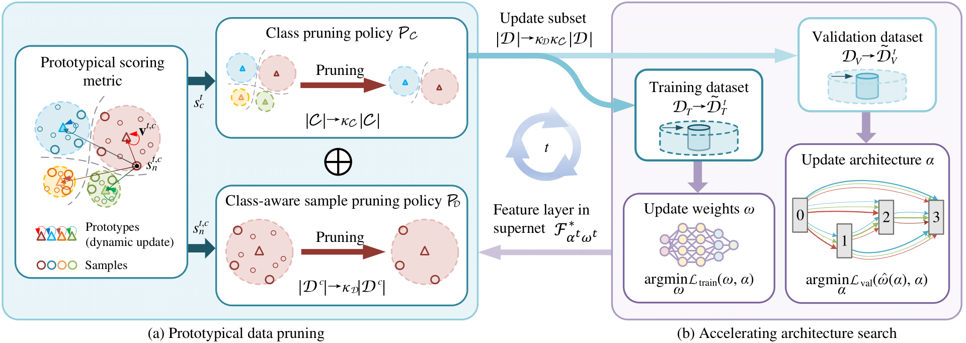 Overview of ProtoNAS for accelerating neural architecture search: (a) In the prototypical data pruning, we introduce a novel scoring metric that is based on the distance between a sample's feature vectors output by a specific feature layer in the supernet $\mathcal{F}^*_{\alpha^t,\omega^t}$ and its corresponding class-specific prototype. The prototypes are dynamically updated throughout the search phase. The score of a sample is formulated as the prototypical distance and its running variance. We then propose an innovative prototypical class pruning policy $\mathcal{P}_\mathcal{C}$ that efficiently accelerate the search phase without compromising the overall performance of the searched architecture. In addition, a class-aware sample pruning policy $\mathcal{P}_\mathcal{D}$ is introduced according to the score of each sample. The sample pruning policy is able to maintain the sample distribution of the dataset, circumventing class bias after the pruning. (b) The proposed prototypical data pruning promises lossless searching acceleration with significant pruning rate.