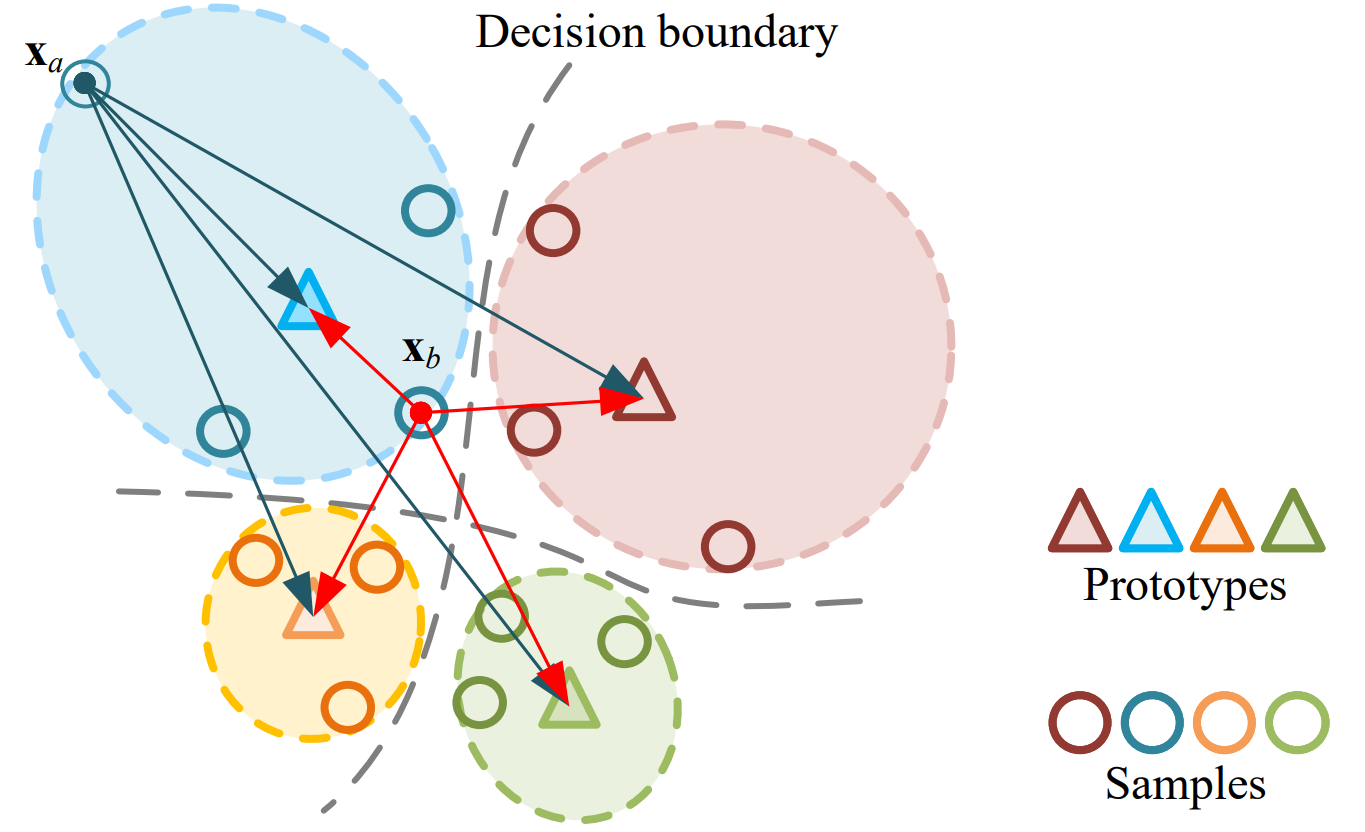 Illustration of prototypical distance in the embedding space. Samples $\textbf{x}_b$ can be assigned with a larger prototypical distance than samples $\textbf{x}_a$, despite having a smaller Euclidean distance. Therefore, the employed prototypical distance facilitates more precise score assignments compared to alternative scoring metrics.