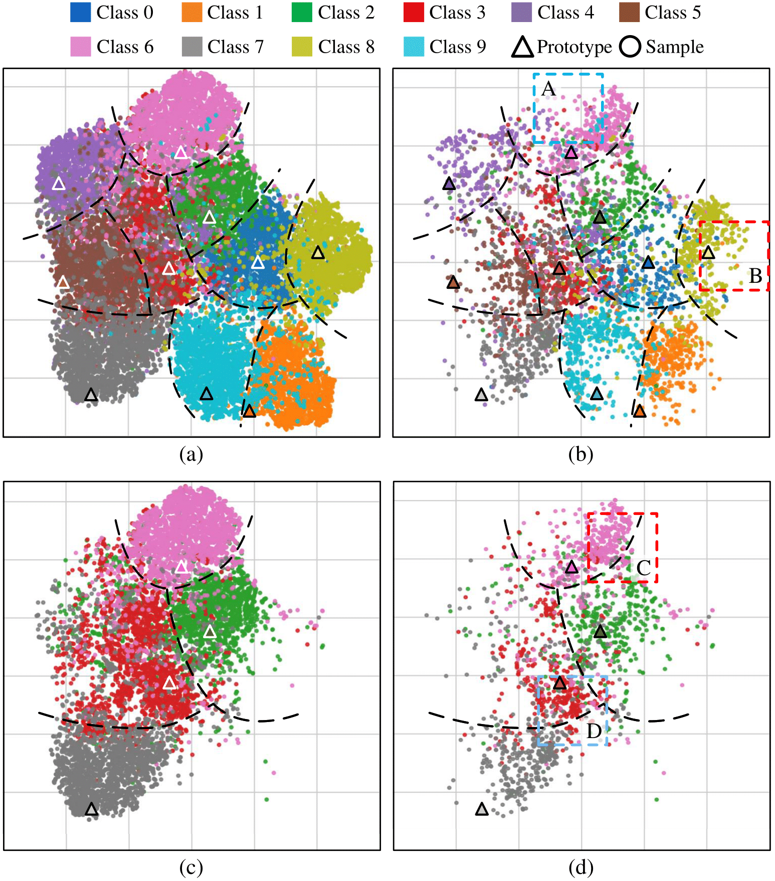 Data visualization: Distribution of samples at different stages when using the prototypical data pruning policy. (a) and (b) are the distributions of all samples and selected samples before class pruning, respectively. (c) and (d) are the distributions of all samples and selected samples after class pruning, respectively. The sample features are derived from the search phase of ProtoNAS (PC-DARTS) on NAS-Bench-1shot1-Space 1.
